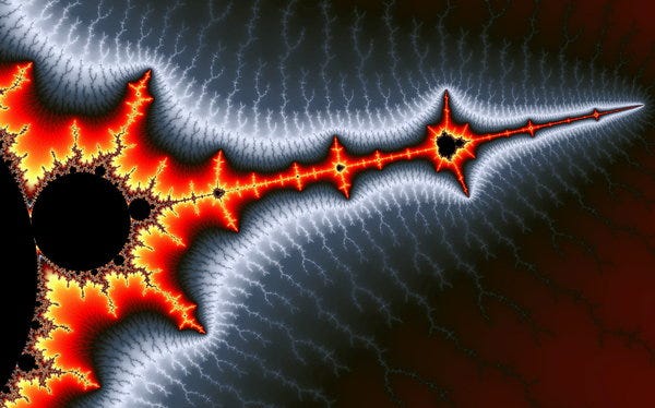 As we zoom into the Mandelbrot Set border, the pattern we see is unpredictable, non-repeating, and infinite. But there is indeed a pattern. It makes sense. It’s a combination of randomness and determinacy. Like a timeless song, or a subtly hilarious meme, though humanly created, it’s as if the notes or the joke could never have been any other way. Once witnessed, the pattern’s acceptance is inevitable.
